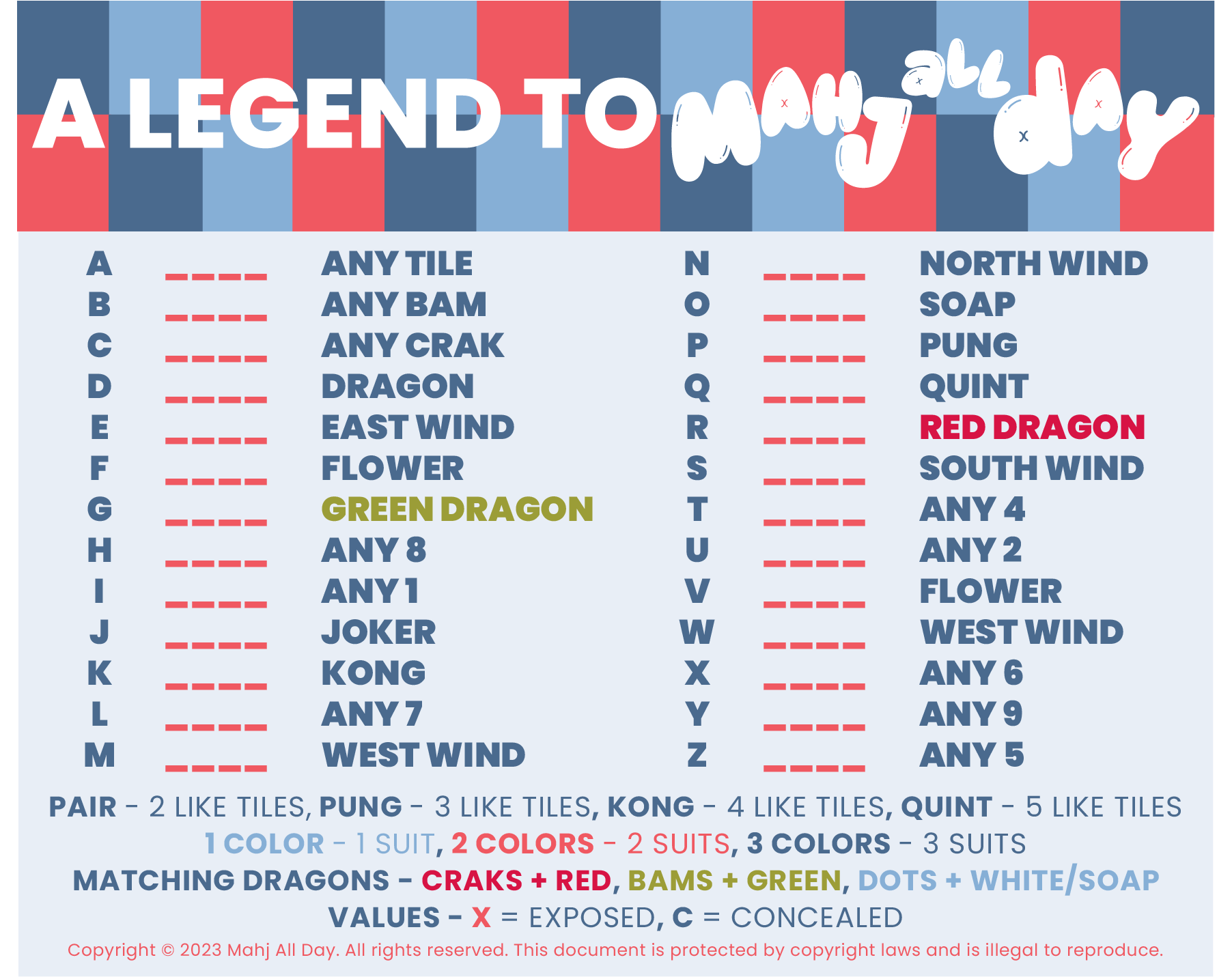 Whether it's a card from the National Mah Jongg League or an alternative Mahjong Card, all MAHJ ALL DAY Cards follow the exact same American Mahjong Rules PLUS give you a creative way to spell phrases with your tiles and sing along with some of your favorite songs.